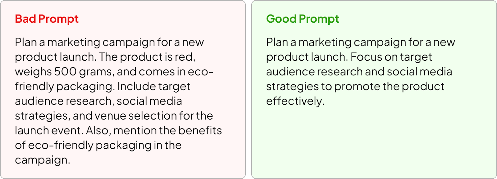 Imagine asking someone to complete a task with too much irrelevant information—they’d likely feel overwhelmed and miss the main point. The same applies here. Overloading your prompt with excessive details can lead to an unfocused response.