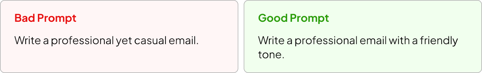 Baking a cake without a recipe? You’d probably struggle! It’s the same with AI—it works best with clear instructions. Be specific about what needs to be done, the provided input (if any), the tone you want, the level of detail, and the preferred format.